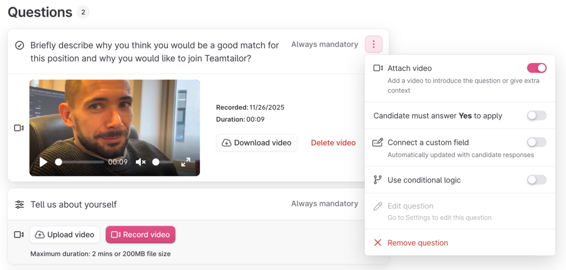 Désormais, vous pouvez ajouter une courte vidéo directement dans le formulaire de candidature pour vous présenter et poser le contexte dès le départ. Une simple introduction vidéo permet souvent de créer une relation plus humaine et d’encourager des réponses plus réfléchies et personnelles de la part des candidats.
